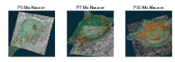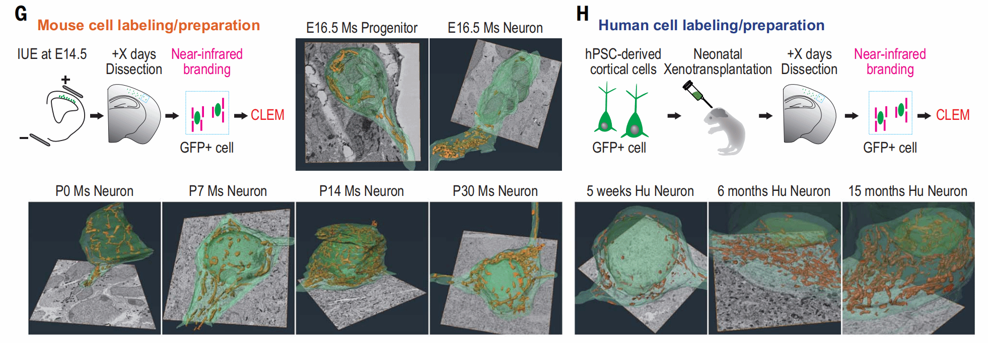 在小鼠胚胎发育第14.5天,通过体内电穿孔用eGFP标记小鼠胚胎的皮质神经元,随后进行CLEM分析,在荧光显微镜结果中叠加电镜照片,获得了高分辨率的细胞结构信息,其中黄色代表线粒体结构。在小鼠体内,线粒体的大小和丰度在出生后第三周达到最大水平。