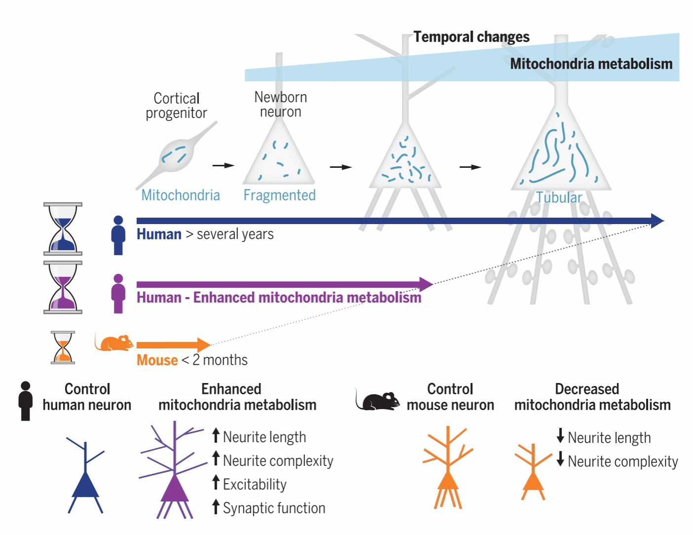 你是否想过,为什么人类婴儿需要数十年才能完全成熟,而同样的过程在小鼠体内却只需几周?这背后不仅关乎体型差异,更与不同物种间大脑发育的独特节奏密切相关。相比于小鼠,人类大脑皮层神经元需要数年才能发育成熟,这种“慢工出细活”的模式,这被认为是人类高级认知能力的生物学基础。一项发表于《Science》的研究揭示了这一现象背后的关键机制——线粒体代谢的“生物钟”。