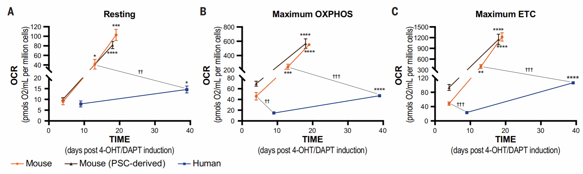 用Oxygraph液相氧电极法,测量了小鼠和人皮质神经元的线粒体耗氧率OCR,可以看出,在早期阶段,小鼠线粒体OCR高于人类且增加速率更快,这也与之前形态学的结果一致。
