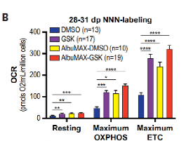 同样地,如果用游离脂肪酸AlbuMAX处理,促进TCA循环,也同样的导致了线粒体OCR的增加。如果将AlbuMAX与GSK联用,效果也有所提升。
