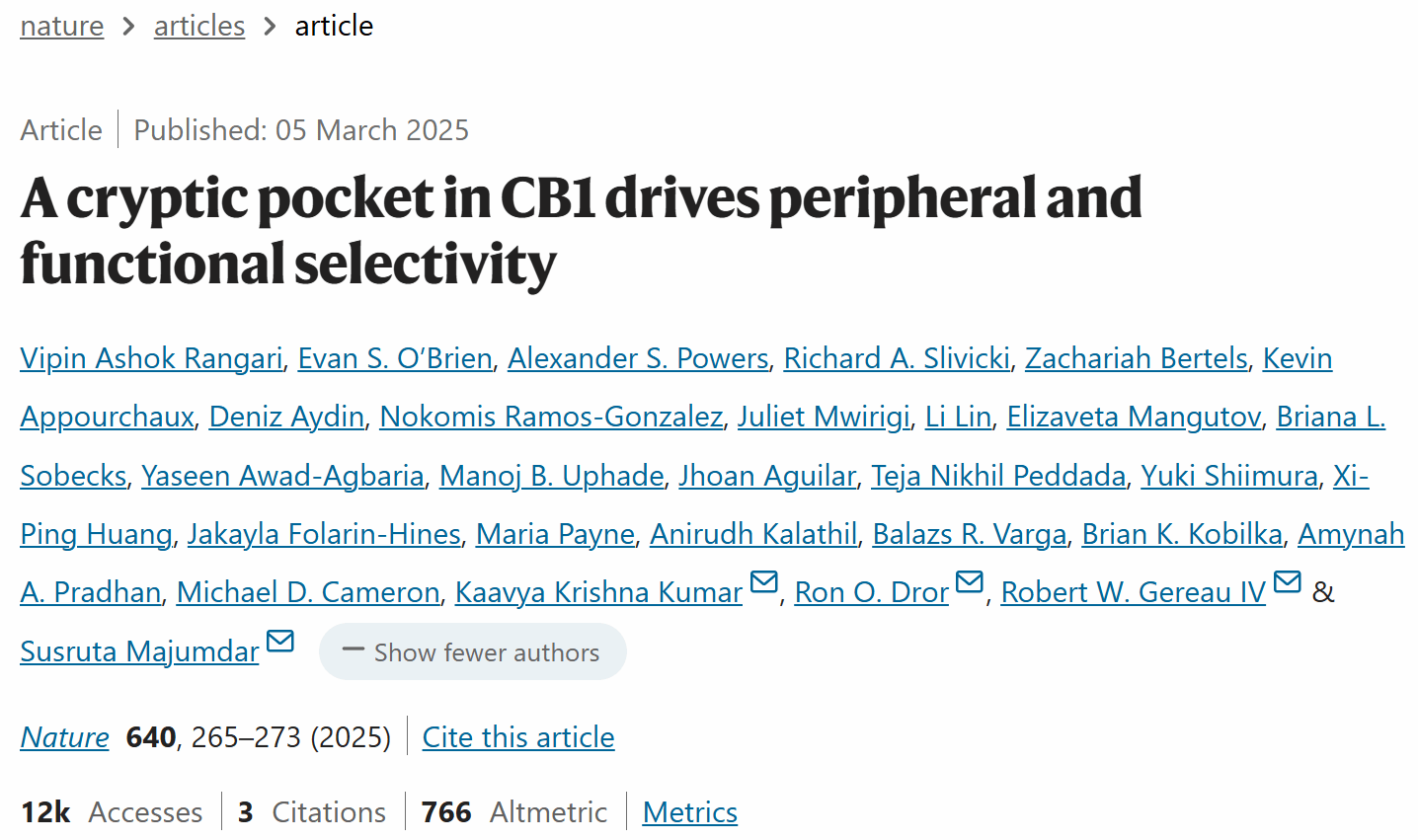 来自美国华盛顿大学医学院的Susruta Majumdar和Robert W. Gereau IV以及斯坦福大学的Ron O. Dror和Kaavya Krishna Kumar团队合作通过基于结构的理性设计策略开发了新一代CB1受体激动剂。该激动剂不仅具有外周限制特性,而且能够选择性抑制β-arrestin信号传导。相关研究“A cryptic pocket in CB1 drives peripheral and functional selectivity”于2025年3月5日发表在《Nature》杂志上。