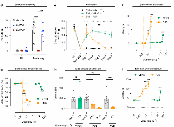 其中,对SNI模型小鼠腹腔注射VIP36(1 mg/kg),每日两次,持续9天,逆转了SNI诱导的异常疼痛,且这一效果在测试期间持续存在。相比之下,FUB在第3天开始出现耐受性迹象。