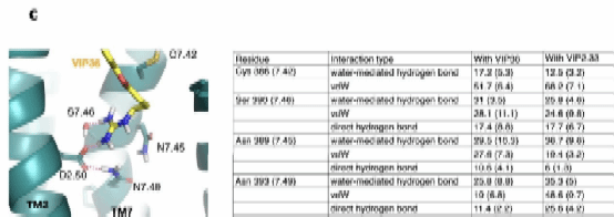 值得注意的是,冷冻电镜密度图明确显示VIP36中的胍基位于预测的隐蔽口袋中。“常规活性”构象中的W3566.48与VIP36中的胍基linker不兼容,因此W3566.48向外移动到初始分子动力学模拟所预测的构象,导致其“活性-开放”构象,并伴随TM3螺旋的V2043.40残基外移以适应新的旋转状态。