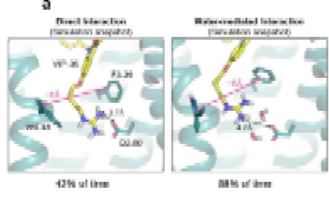 VIP36的胍基在冷冻电镜结构中未直接接触D2.50位点,而是与构象转换残基形成阳离子-π相互作用(与W3566.48和F2003.36的距离分别为4.0 Å和4.4 Å),并与N3897.45形成强氢键。D2.50位点与胍基距离6-7 Å,排除了二者具有典型盐桥相互作用的可能性。这一现象与在μOR中的研究显著不同,后者设计的双位点配体与D2.50位点存在清晰的离子相互作用。将VIP36-CB1的冷冻电镜结构嵌入水合脂质双层中进行了分子动力学模拟,能观察到VIP36与D2.50位点间存在长程水介导的相互作用,而有时则是短程(<3.5 Å)电荷-电荷相互作用。