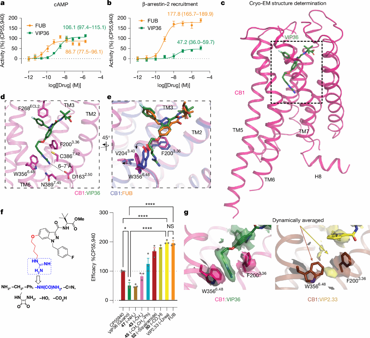 为研究VIP36与CB1受体的相互作用并验证其结合机制,研究人员解析了VIP36与Gi1偶联的CB1复合物的冷冻电镜结构,分辨率为2.86 Å。VIP36在表征G蛋白活性的cAMP测定和基于BRET的β-arrestin-2募集测定中显示出符合预期的G蛋白信号传导偏向性。其FUB部分与CB1受体之间存在一系列保守相互作用,包括第二胞外环(ECL2)的F268ECL2残基直接堆积,以及与关键构象转换残基F2003.36形成π-π相互作用。