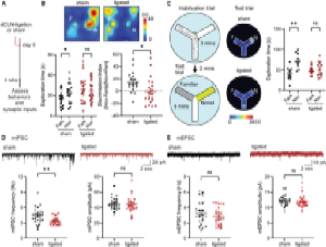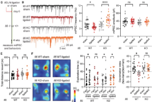 在 IL -6基因敲除小鼠中,dCLN结扎不再导致mIPSC频率下降,反而出现上升,且在新颖物体识别测试中探索行为正常,提示IL-6是介导dCLN结扎相关突触与行为表型的关键因子 (图 6 ) 。