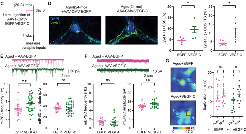 随着年龄增长,脑膜淋巴管的结构与功能逐渐退化。为增强脑膜淋巴功能,研究人员向老年小鼠颅内注射AAV1-CMV-mVEGF-C(一种重建或增强脑膜淋巴引流通路的基因治疗工具),结果显示可显著扩展Lyve1+淋巴管覆盖区域,并恢复老年小鼠mPFC中降低的mIPSC频率。结果表明,增强脑膜淋巴引流可有效缓解老年相关的突触与认知衰退(图7)。