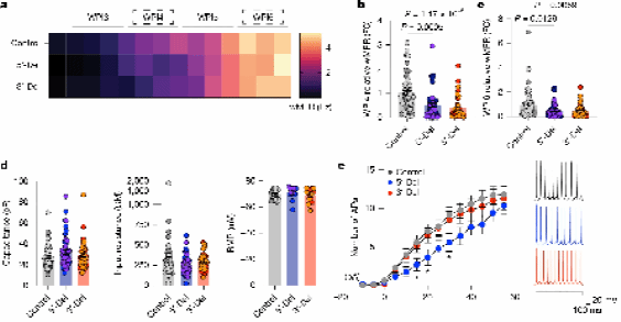 与此同时,他们观察到未成熟的NRXN1+/−iGABA神经元在5′-Del和3′-Del两种情况下,自发网络活动均显著提升了约两倍。然而,在成熟的iGABA神经元中,5′-Del和3′-Del神经元的平均wMFR显著下降。与iGLUT神经元类似,成熟的iGABA神经元在NRXN1+/−5′-Del或3′-Del与对照组之间,其被动和内在兴奋性膜特性没有显著差异。总体而言,患者特异性的自发神经活动变化不能完全由被动和兴奋性膜特性的差异来解释。