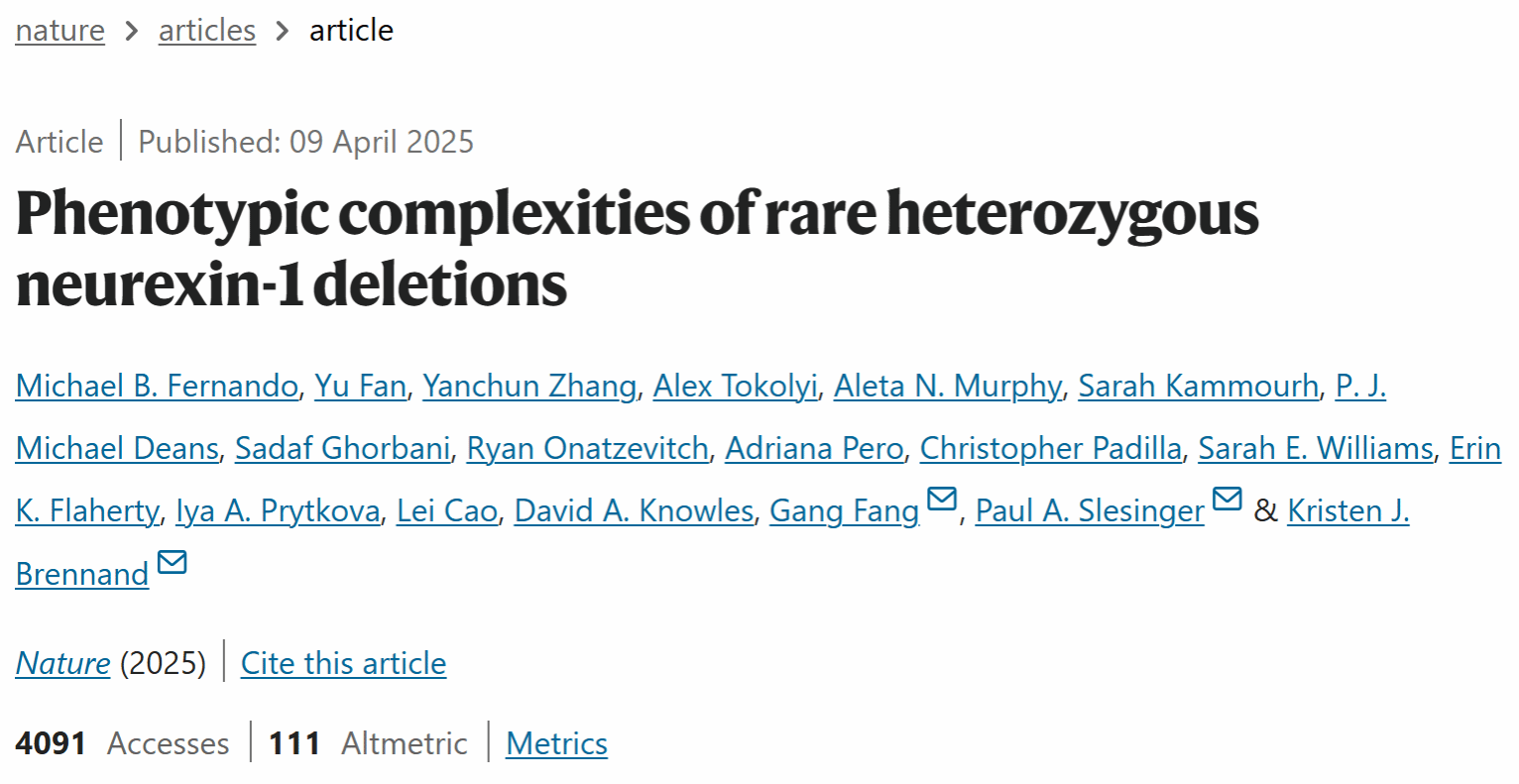 [2]Fernando MB, Fan Y, Zhang Y, et al. Phenotypic complexities of rare heterozygous neurexin-1 deletions. Nature. 2025 Apr 9.