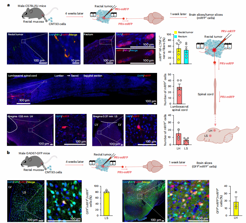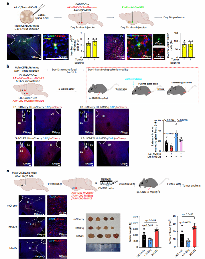 既然肿瘤与神经纤维密切相关,那么这些神经纤维的“大脑源头”在哪里?研究团队采用伪狂犬病毒(PRV)逆行追踪技术——将表达红色荧光蛋白(mRFP)的PRV注射到小鼠直肠肿瘤内,病毒会沿神经纤维逆向传递,标记整条神经环路的神经元。1周后,荧光信号不仅出现在肿瘤内得神经纤维,直肠和脊髓中得胆碱能神经元,还在大脑的外侧隔核(LS)和下丘脑外侧区(LH)检测到大量mRFP+神经元。进一步用绿色荧光蛋白(GFP)标记LS内的GABA能神经元发现,mRFP+神经元多GFP+共定位,说明LS内的GABA能神经元是调控肠道肿瘤的关键大脑中枢。