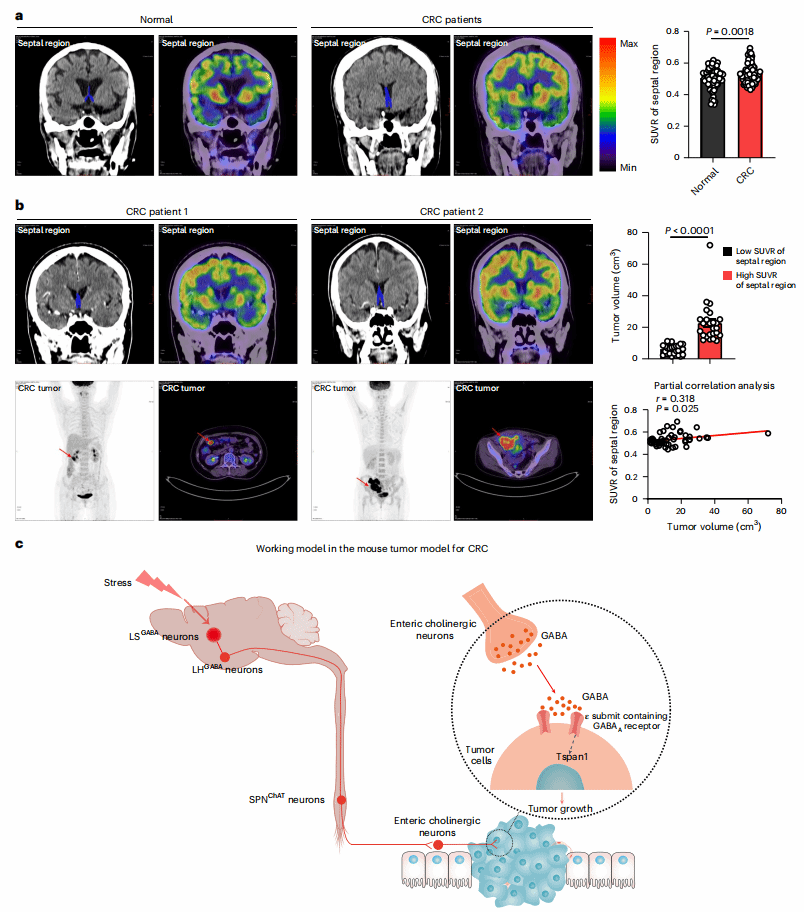 结直肠癌患者的隔核区域标准化摄取值比(SUVR)比健康人高;进一步分析51例初次确诊未治疗的结直肠癌患者,隔核SUVR与肿瘤体积呈正相关——隔核活性越高,肿瘤越大。这一发现为结直肠癌的临床评估提供了全新的“脑影像标志物”:通过PET/CT检测隔核活性,有望预测肿瘤进展速度,为个体化治疗提供参考。