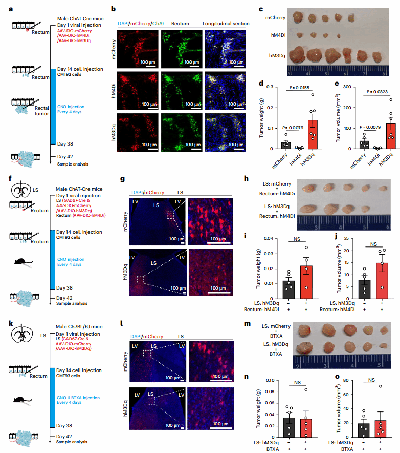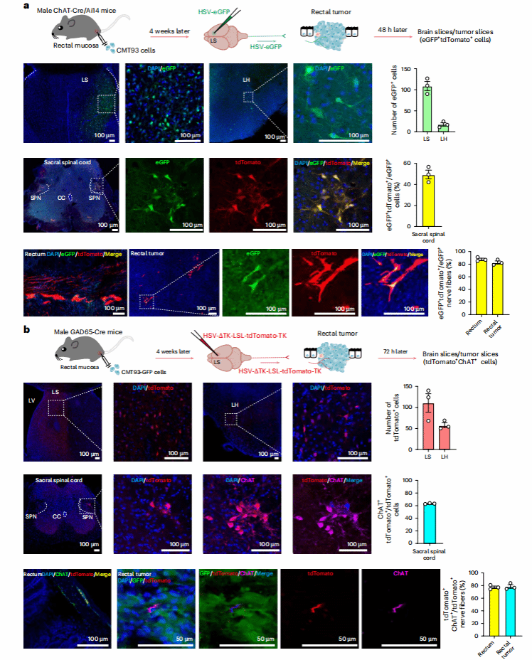 团队又通过单纯疱疹病毒(HSV)顺行追踪:将HSV-eGFP注射到ChAT-Cre/Ai14小鼠(小鼠胆碱能神经元表达tdTomato)LS,48小时后,直肠肿瘤中的大多数eGFP+神经纤维与tdTomato+共定位;在GAD65-Cre小鼠LS注射HSV-ΔTK-LSL-tdTomato-TK,72小时后肿瘤中tdTomato+纤维也多表达ChAT。