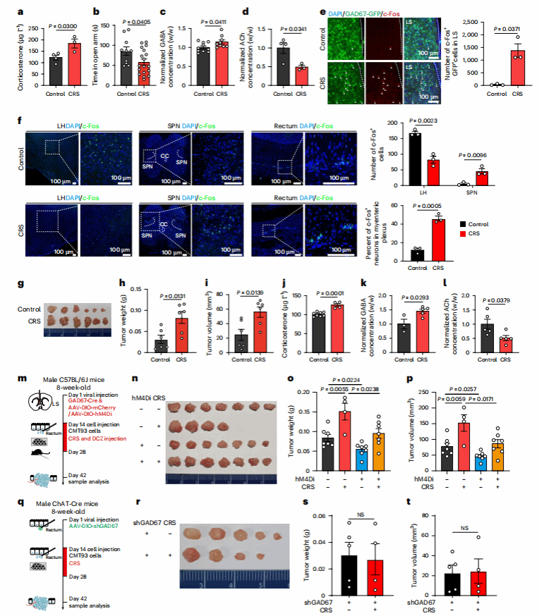 神经层面:CRS小鼠的LSGABA神经元活性显著升高,同时结直肠组织中的GABA增加,乙酰胆碱减少;