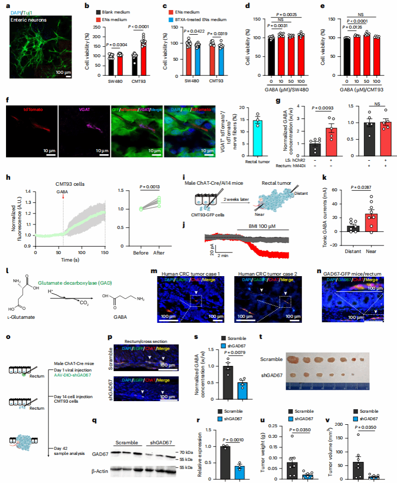 体内实验:检测肿瘤内GABA浓度发现,激活LSGABA神经元后,肿瘤内GABA水平升高。进一步研究发现,肠道胆碱能神经元通过谷氨酸脱羧酶(GAD67)将谷氨酸转化为GABA,若用shRNA敲低GAD67表达,肿瘤内GABA浓度下降,肿瘤体积缩小。