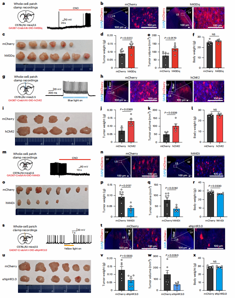 化学遗传学激活:向GAD67-Cre小鼠LS注射表达hM3Dq(一种受药物CNO激活的受体)的病毒,给小鼠注射CNO后,LS hM3Dq+神经元c-Fos表达升高,且直肠肿瘤重量与体积显著增加;光遗传学激活同样显著促进肿瘤生长。