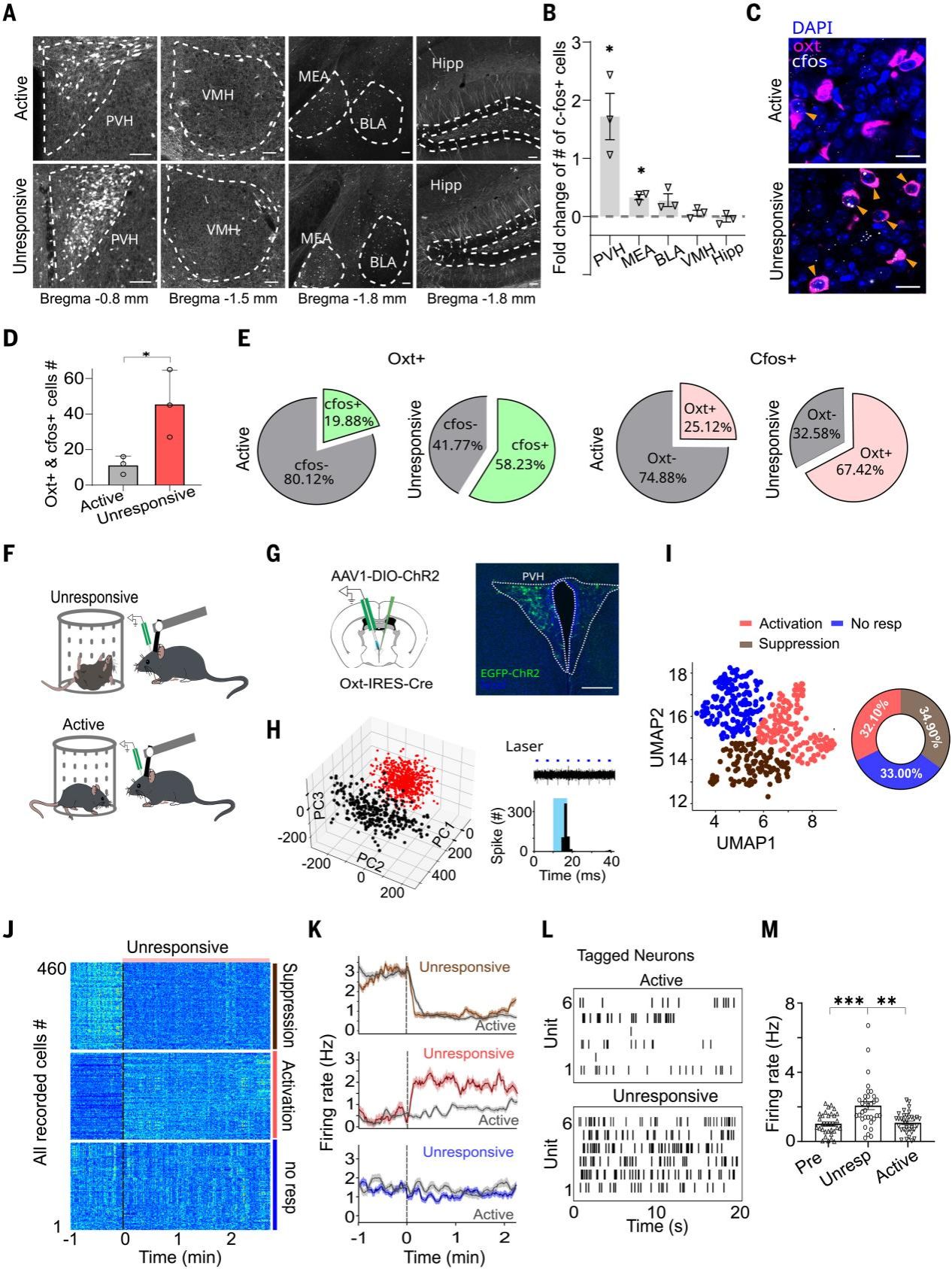 为了探究小鼠对无反应同伴行为的神经机制。研究人员通过让Trap2::Ai14小鼠接触麻醉或活跃同伴后标记激活的神经元,发现接触无反应同伴的小鼠下丘脑室旁核(PVH)区域c-fos表达增加。接着,研究人员通过RNAscope技术,使用催产素和c-fos特异性探针进行染色,进一步探究当小鼠接触无反应同伴时,PVH的催产素神经元是否会被激活。实验发现:接触无反应同伴的受试小鼠,其PVH脑区激活的催产素神经元数量显著增加。为直接验证PVH脑区催产素神经元的激活情况,研究人员向Oxt-Cre小鼠的PVH脑区注射编码Cre依赖型通道视紫红质2(ChR2)的腺相关病毒(AAV),并在清醒头部固定状态下进行光极记录。结果显示小鼠接触无反应同伴后,群体平均放电率的升高幅度显著大于接触活跃同伴时。这些数据表明,当受试小鼠检测到同伴处于无反应状态时,其催产素神经元的活性会升高。