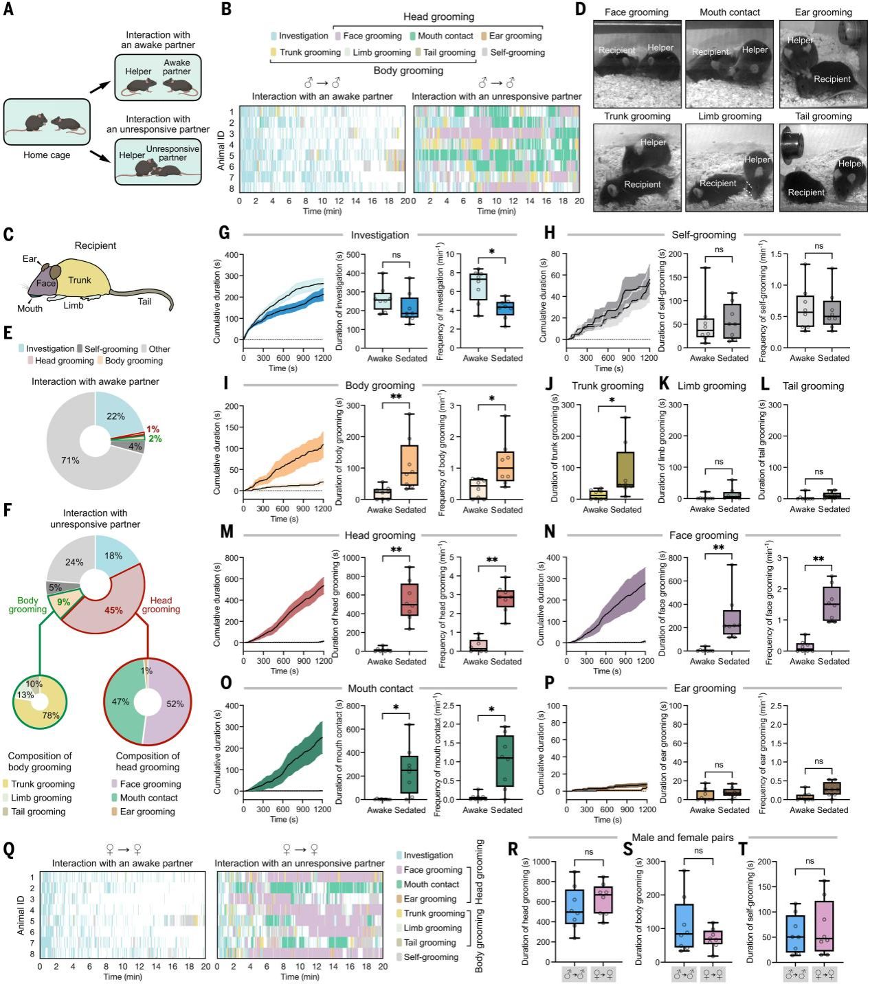 洪暐哲团队研究人员通过注射右美托咪定诱导同伴小鼠进入深度镇静状态(无反应状态),并观察“helper鼠”与清醒或镇静同伴小鼠的互动。实验发现:helper鼠对镇静同伴小鼠的梳理时间显著长于清醒同伴小鼠,且该行为在雌雄小鼠中均存在,不受同伴小鼠性别的影响;这种梳理行为主要集中在同伴头部(尤其是面部和口腔区域),占总梳理时间的大部分;当同伴从清醒逐渐过渡到镇静状态时,helper鼠的社交探索行为减少,头部梳理行为随之增加,且同伴镇静程度越深,helper鼠的头部梳理(尤其是口腔接触)行为越频繁,证明小鼠能感知同伴的无反应状态,并以头部梳理为主要行为反应,这种行为与同伴清醒程度相关。