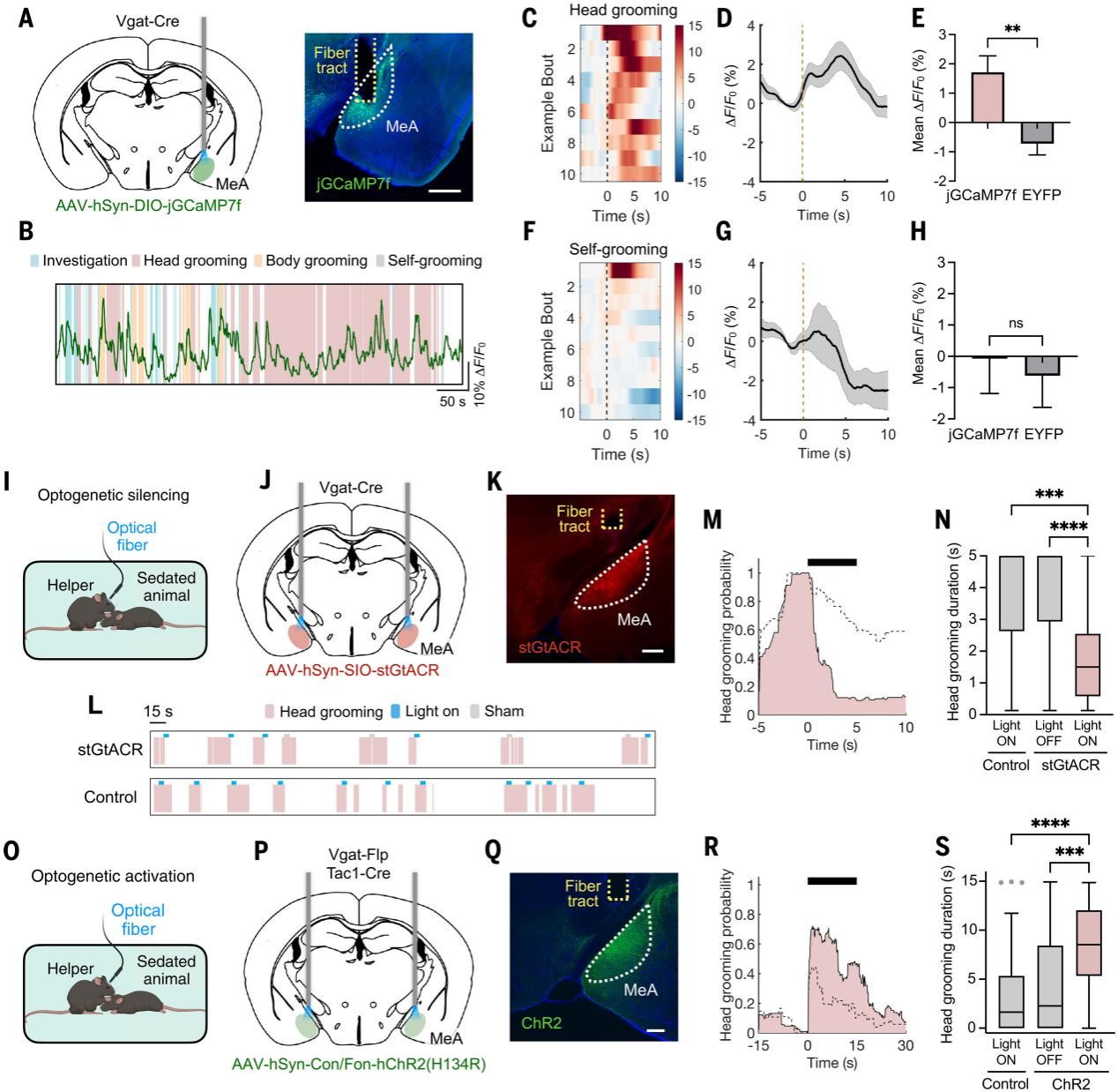 研究人员记录MeA Vgat⁺神经元的Ca⟡⁺动态变化发现,MeA Vgat⁺神经元在头部梳理行为期间表现出Ca⟡⁺信号升高;在自我梳理行为期间未表现出活性增加。另外还利用stGtACR2进行光遗传学抑制,结果显示,抑制MeA Vgat⁺神经元能显著缩短头部梳理的持续时间。这表明,MeA Vgat⁺神经元是小鼠针对无反应同伴的头部梳理行为所必需的。并且,对MeA中Vgat⁺神经元的一个表达神经肽基因Tac1的亚群进行光遗传学激活,结果显示,激活这类神经元会增加针对无反应同伴的头部梳理行为。综上,MeA Vgat⁺神经元在促进针对无反应同伴的头部梳理行为中,发挥着直接的生理性作用。
