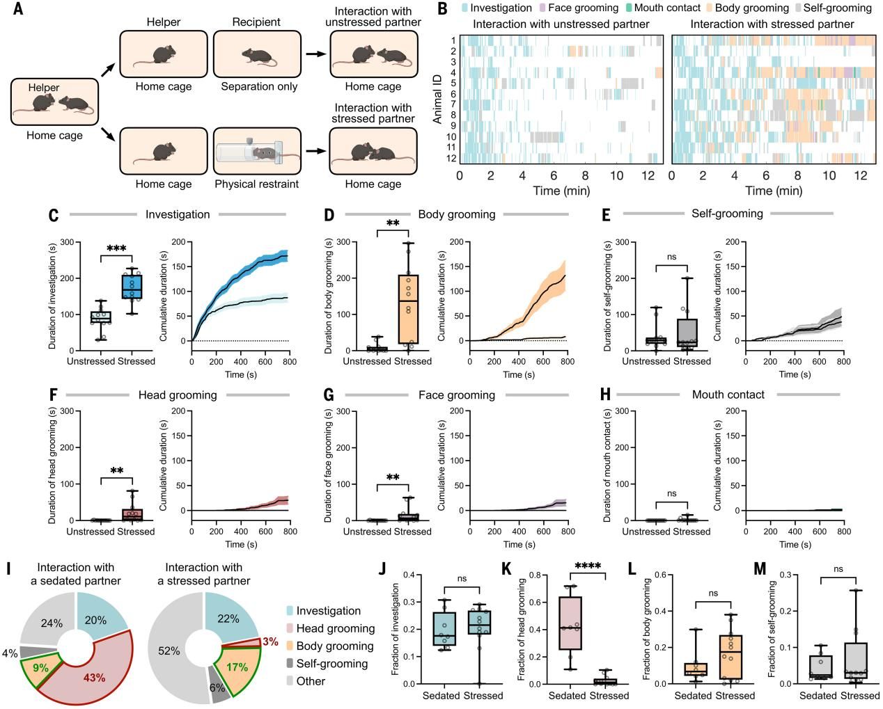 洪暐哲团队研究人员对比小鼠对有压力的清醒同伴和无反应同伴的行为,发现对有压力的同伴,小鼠的梳理行为主要针对身体部位(如背部侧面和颈部);对无反应同伴,则主要针对头部区域。研究人员进一步比较了helper鼠针对压力同伴与无反应同伴的行为差异。结果发现:helper鼠虽会对清醒应激同伴的身体和头部均进行梳理,但大部分梳理行为靶向身体区域,而非头部区域;与之相反,针对无反应同伴时,helper鼠的头部靶向同种梳理时间显著更长,身体靶向同种梳理时间则更短。这表明,小鼠并非将无反应同伴简单视为压力同伴,针对无反应同伴与压力同伴的同种梳理行为,是对他人不同状态的独立行为响应。