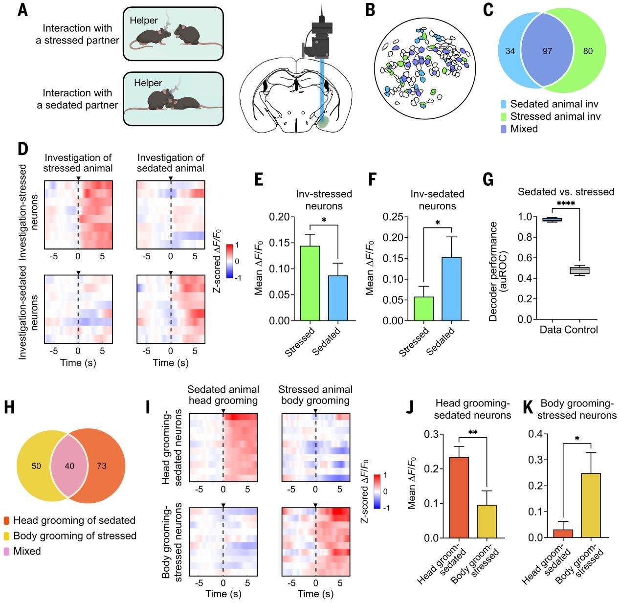 研究人员还进一步比较了“针对无反应同伴的头部梳理”与“针对压力同伴的身体梳理”的神经表征。结果发现:针对无反应同伴头部梳理时激活的细胞中,64.6%在针对压力同伴身体梳理时未被激活;而针对压力同伴身体梳理时激活的细胞中,55.6%在针对无反应同伴头部梳理时未被激活。这些结果表明,与无反应同伴的互动和与压力同伴的互动,代表了不同的社交情境与行为,且二者通过MeA的神经活动进行差异化编码。