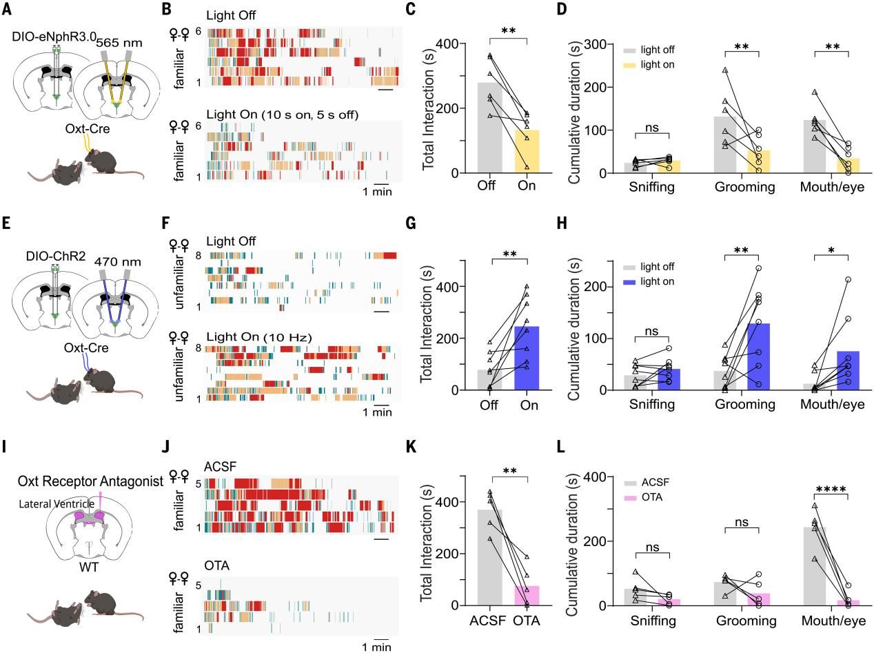 为验证催产素神经元是否参与其中,研究团队通过光遗传激活以及抑制实验证明了催产素神经元的激活及催产素信号的传递,是小鼠对无反应同伴表现出强烈梳理行为和嘴/眼互动行为的必要条件,且增强催产素能活性可促进此类行为的发生。