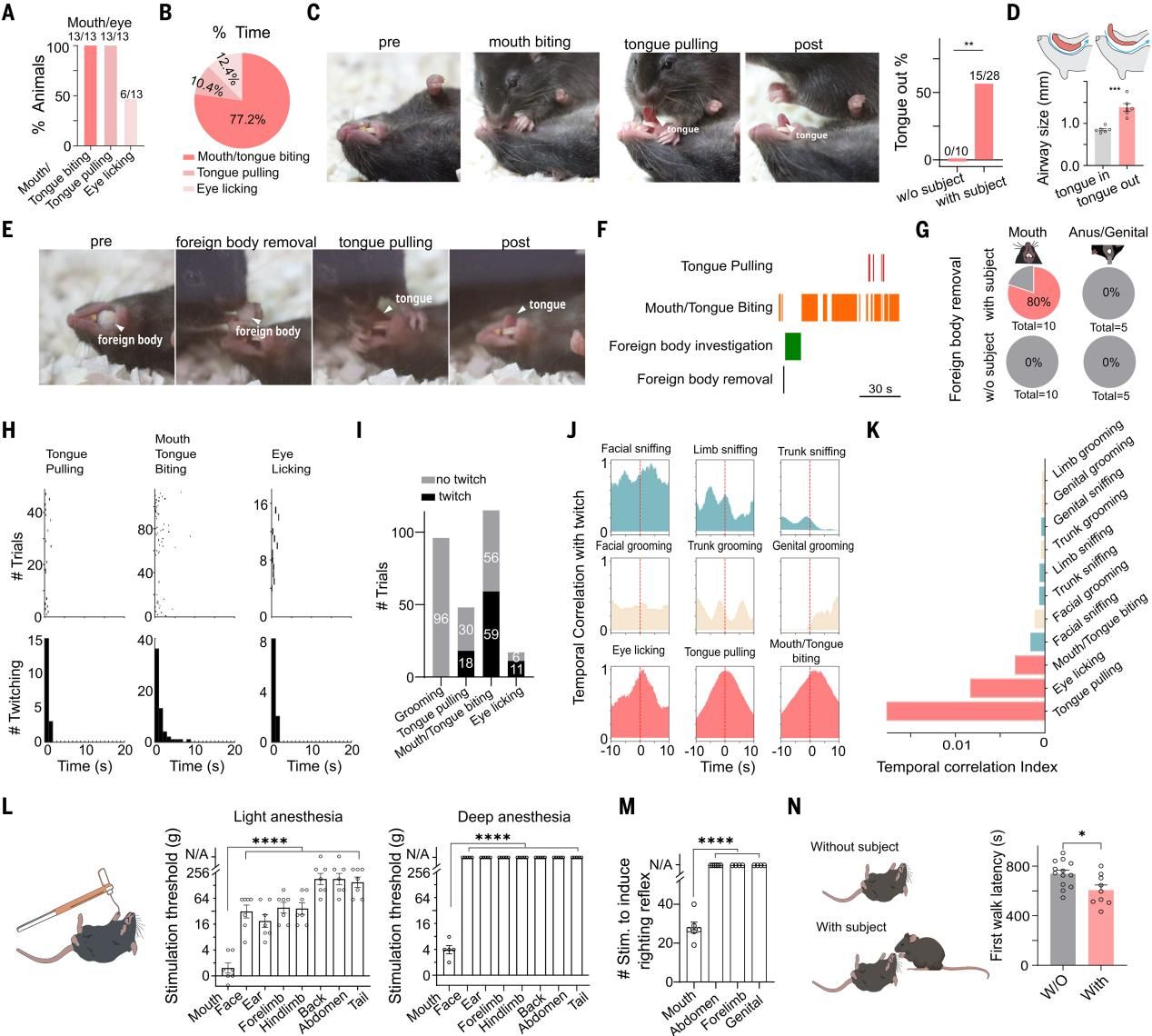 张砺团队利用高分辨率相机仔细观察小鼠针对同伴嘴部和眼部的动作,分辨出具体动作细节,包括咬嘴、咬舌头、拉舌头以及舔眼睛。其中所有实验小鼠都做出针对嘴部或舌头的动作,且占互动时间最长;超50%的情况下,受试小鼠还会把同伴舌头拉出来,这能让同伴气道变宽,像人类急救时防气道堵塞的操作。更让人惊讶的是,80%的情况下,受试小鼠能帮同伴取出口腔异物,却无视肛门、生殖器处的异物。另外,这些针对嘴,眼的动作还会让同伴身体发生间歇性的抽搐,因此研究人员通过Von Frey filaments测试麻醉小鼠不同身体部位引发抽搐反应的刺激阈值,发现刺激小鼠口腔内侧,引发抽搐的阈值最低、且让小鼠清醒所需的次数也最少。