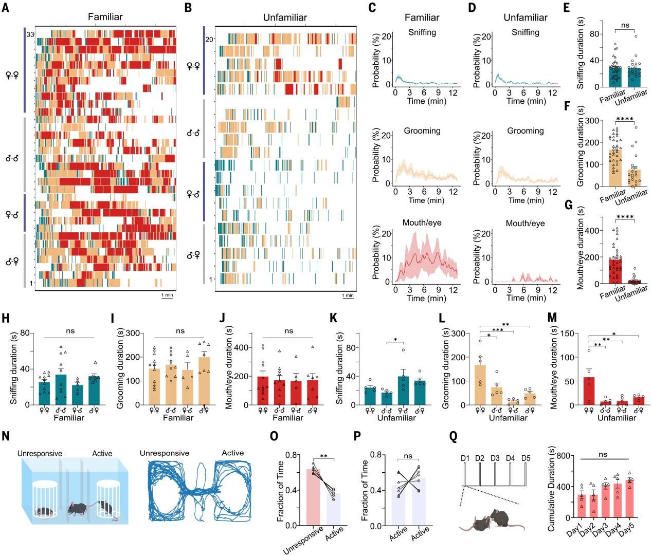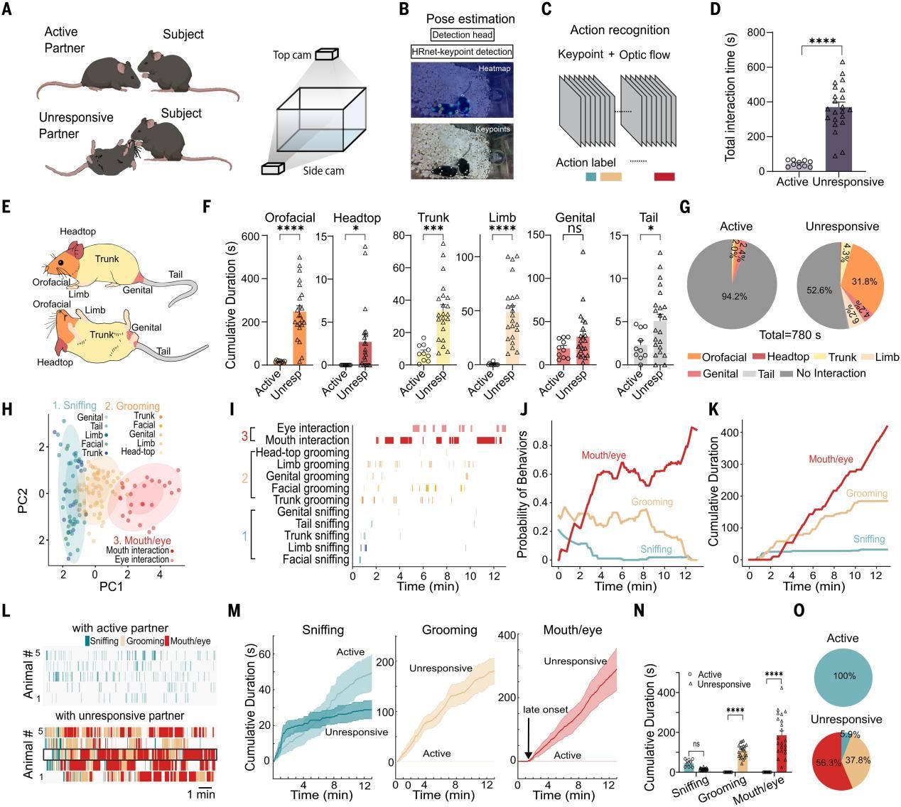 由此研究人员将小鼠行为分为三类:1类为对各部位的嗅探,2类为对各部位的轻柔接触(如梳理),3类为以眼部、口腔为核心的接触。受试小鼠面对无反应同伴时,嗅探和梳理在同伴引入后几乎立即出现,而眼部口腔互动则延迟出现并逐渐增强,且后者持续时间更长、发生次数更多,总时长超过嗅探和梳理;而面对活跃同伴,受试小鼠仅表现出间歇性嗅探。综上,小鼠面对无反应同伴时会展现出区别于面对活跃同伴的,独特的行为模式,说明小鼠能区分同伴的不同状态并做出不同反应。