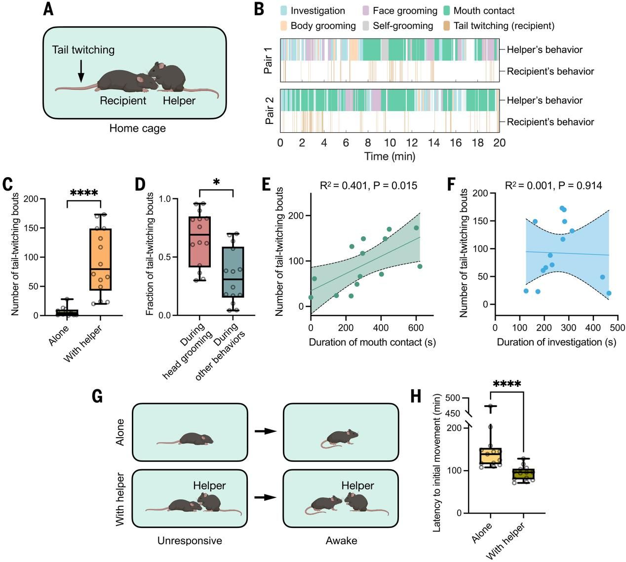 洪暐哲团队发现当小鼠处于无反应状态时,它们偶尔会表现出尾部抽搐,这反映的是当感觉输入强烈时对外部刺激的反应。当无反应同伴与helper鼠放在一起时,并且helper鼠对无反应同伴进行头部梳理时,无反应同伴的尾巴抽搐次数增加,且尾巴抽搐次数与嘴部接触时间呈正相关。当有helper鼠陪伴时,被镇静的同伴小鼠从无反应状态恢复的速度更快。