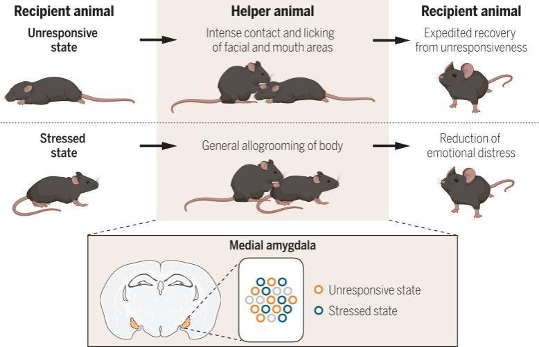 洪暐哲团队研究发现,小鼠会对无反应的同类表现出类似救援的行为,其特征是强烈地针对无反应同类头部区域进行身体接触。这种行为能加速无反应状态的恢复,可能降低无反应个体面临的风险并提高其生存率。还发现,内侧杏仁核(MeA)能编码其他个体的无反应状态,并驱动针对其头部的理毛行为。值得注意的是,对无反应同类的行为反应与对清醒应激个体的反应存在差异,且这些反应在内侧杏仁核中的神经表征也不同。这些发现揭示了针对无反应个体亲社会行为的神经机制,拓宽了我们对动物识别并行为应对同类不同逆境状态能力的认知。