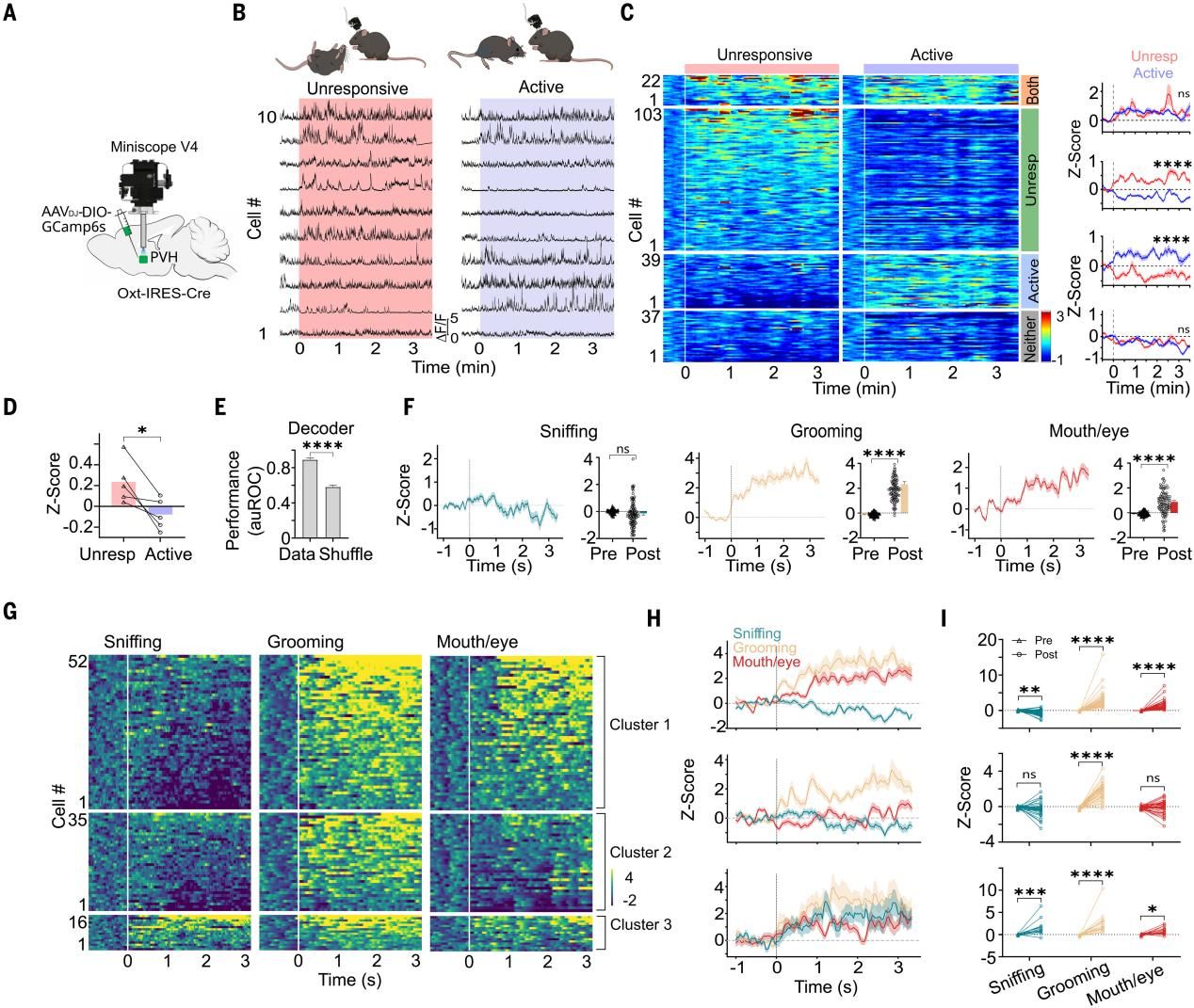 另外在小鼠自由活动状态下,通过Miniscope记录其催产素神经元的Ca⟡⁺信号。聚类分析显示,相比于接触活跃同伴,大量催产素神经元在接触无反应同伴时激活程度显著升高,51.24%的神经元表现出此类选择性激活。对选择性激活组的进一步分析显示,该组神经元的活性升高与“梳理行为”和“嘴/眼互动”高度相关。这些结果提示,催产素神经元可能在小鼠对无反应同伴的行为反应中发挥关键作用。