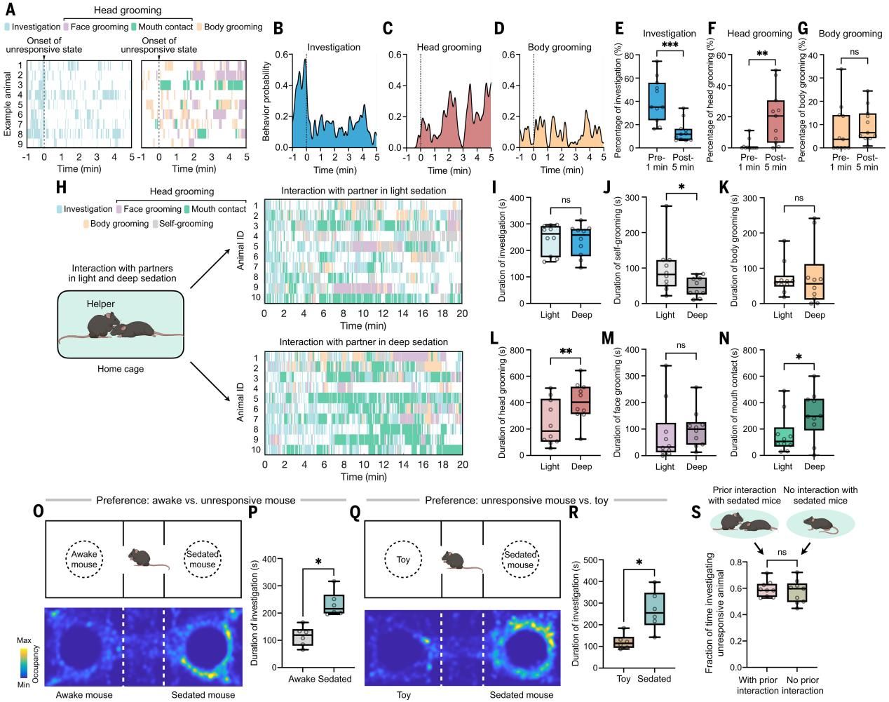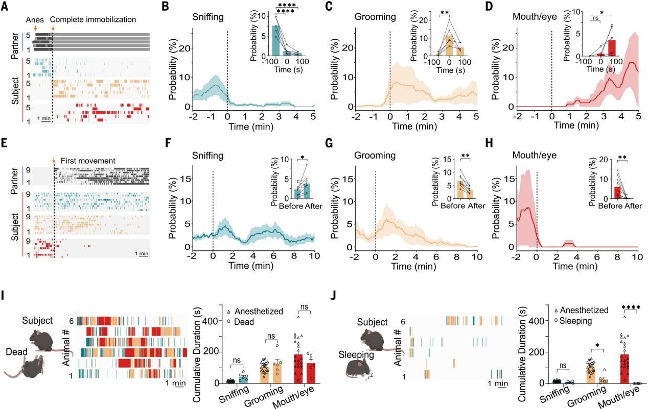 另外,研究人员还观察了小鼠对其同伴从清醒到失去意识再恢复清醒期间的反应:当同伴从清醒到无反应时,受试小鼠先嗅探,当同伴完全不动后,减少嗅探、加强梳理,100秒后转为嘴眼接触;同伴恢复活动时,受试小鼠嘴眼接触减少;同伴完全清醒后嘴眼接触停止,嗅探略增、梳理缓慢减少。此外,受试小鼠对死亡同伴表现出类似对麻醉同伴的行为,但对睡眠同伴仅轻度梳理,无嘴眼接触。综上,小鼠能够区分同伴的无反应与清醒状态,并做出不同的反应。