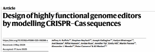 2025年7月30日,AI蛋白质设计公司Profluent Bio的Ali Madani团队在Nature杂志上发表了题为Design of highly functional genome editors by modelling CRISPR–Cas sequences的研究论文。利用大型蛋白质语言模型(protein language models, protein LMs)ProGen2-base及其微调(fine-tuned)版本,让模型直接从大量天然蛋白序列中学习协同进化规律(co-evolutionary patterns),从1,000,000个计算设计中筛选出了相比于SpCas9编辑效率相当、碱基编辑兼容性相当、脱靶率更低、免疫原性更低、对PAM要求更严格、编辑窗口更窄,在“自然界中完全不存在的”Cas9家族“人造”编辑工具OpenCRISPR-1,再次重塑了大家对于CRISPR–Cas系统以及LMs强大能力的理解。
