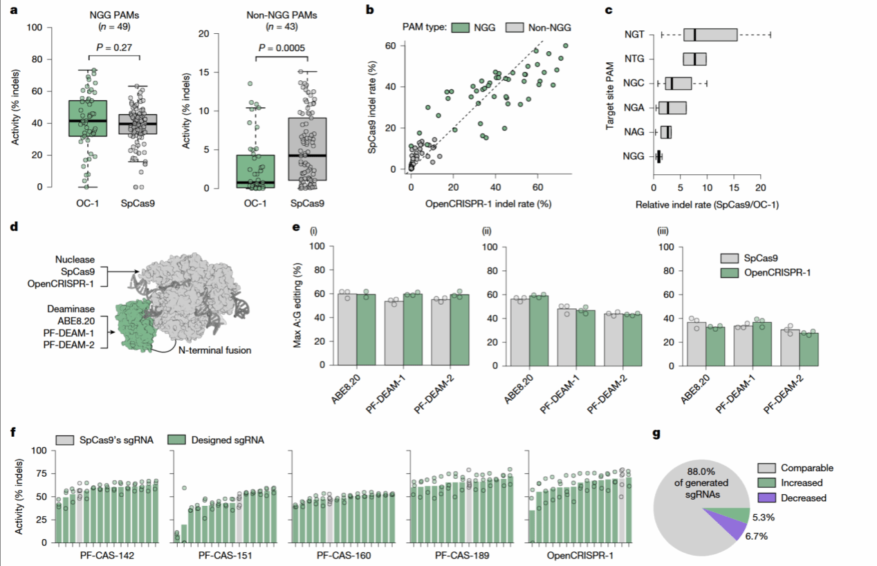 OpenCRISPR-1被进一步测试其作为碱基编辑平台的兼容性。研究者构建了以OpenCRISPR-1为骨架的腺嘌呤碱基编辑器(ABE),并在HEK293T细胞中靶向多个基因。结果显示,其A→G转换效率与SpCas9-ABE相当,且在非目标位点未检测到明显脱靶信号,表明该生成酶能够无缝集成至现有基因编辑工具体系(图6e)。