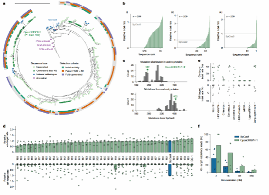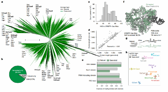 针对这一百万条序列,系统发育树构建显示,生成的蛋白分布在整个Cas9进化空间中,形成了大量此前自然界未见的谱系,生成序列占据系统发育树总分支长度的94.1%,AI模型生成的蛋白不仅数量庞大,更在进化空间上提供了远超自然界的广度,成功扩展了CRISPR–Cas9系统的可能性边界(图4a、b)。生成序列与天然序列的序列相似性显示,Cas9与天然序列的同一性分布,主要集中在40–60%区间。如此低的序列同一性说明模型并非复制天然蛋白,而是生成了与自然Cas9相关但显著不同的全新变体。这种差异程度与自然进化中新型Cas9的发现趋势相当,显示语言模型生成的序列具有新颖性,并很可能接近真实的进化过程(图4c)。在主要功能结构域的保留率,48.2%的生成Cas9具有完整功能域组合,这表明尽管序列新颖,模型生成的蛋白仍维持了功能上关键的结构完整性(图4e)。