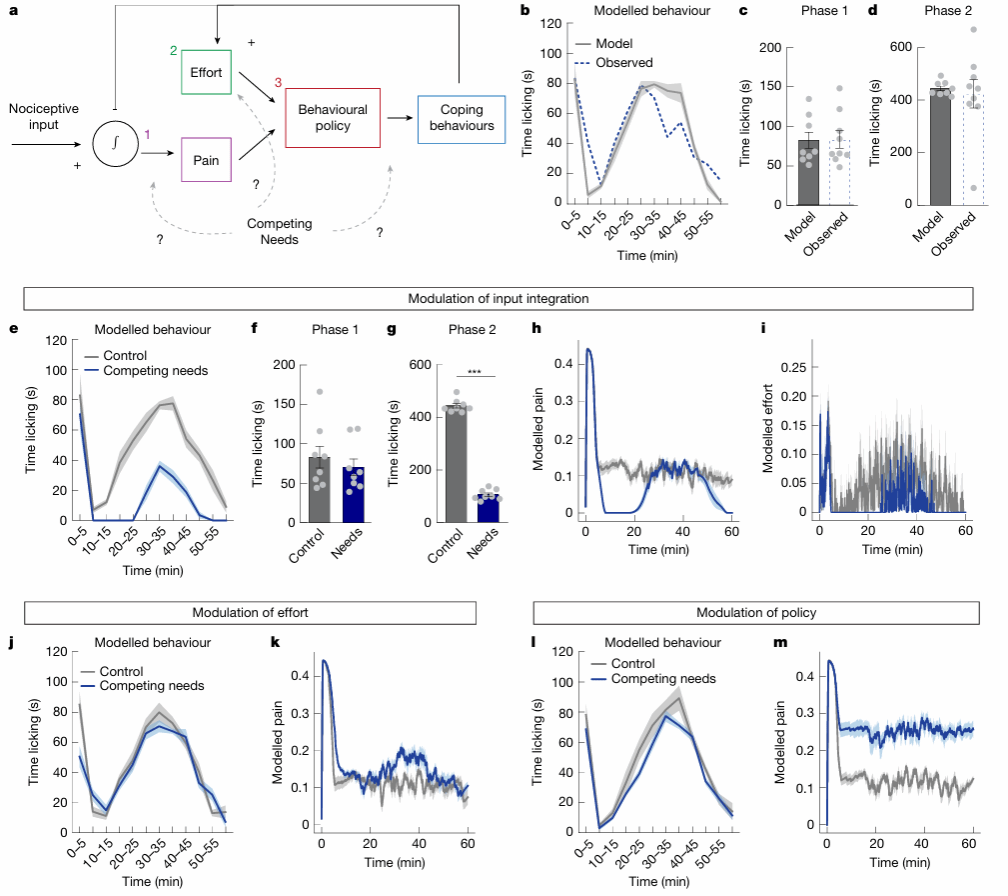 至此,研究团队已经确定,lPBN中的Y1R神经元在持续性疼痛中被激活,而饥饿、口渴和恐惧通过NPY–Y1R信号抑制这些与疼痛相关的行为反应。为了推测生存威胁如何通过NPY信号调节疼痛感知和行为反应,团队随后根据小鼠行为状态建立了强化学习数学模型。模型假设疼痛状态由“Pain(疼痛)”和“Effort(付出,即做出舔舐行为)”两个变量构成,舔舐行为可减轻“Pain”但消耗“Effort”。模拟结果表明,生存威胁主要通过门控效应抑制痛觉的上行传导,从而减少舔舐行为,而其他模型则无法再现实验结果,这一结果进一步支持了lPBN中NPY通过降低疼痛输入来抑制持续性疼痛的假说