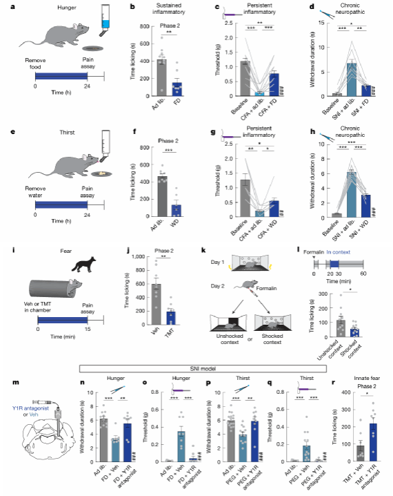 在确认了Y1R神经元介导持续性疼痛后,研究团队思考其是否在生存威胁下(如饥饿、口渴和恐惧等)发挥疼痛缓解作用。行为学实验发现,食物剥夺、水剥夺和捕食者气味均能显著减轻福尔马林诱导的炎症性疼痛和神经病理性疼痛的持续性反应,而对急性疼痛无影响。与此同时,通过lPBN局部注射Y1R受体拮抗剂,可阻断这些生存威胁状态对疼痛的抑制作用,说明PBN通过作用于Y1R受体发挥生存威胁状态下的镇痛作用。