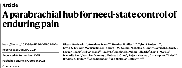 2.Goldstein N, Maes A, Allen HN, et al. A parabrachial hub for need-state control of enduring pain. Nature. 2025 Nov;647(8090):689-697.
