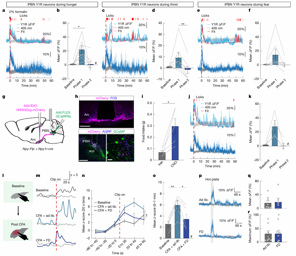 本研究揭示了一群位于外侧臂旁核(lPBN)、表达神经肽Y1受体(Y1R)的神经元,它在调控持续性疼痛中扮演着核心的“枢纽”角色。这些神经元在空间和分子层面上具有多样性,其持续性的活动模式特异性地编码了由损伤引发的持续性疼痛状态,而非短暂的急性伤害感受。更关键的是,研究发现饥饿、口渴和恐惧等生存威胁状态,能够通过lPBN的Y1R阳性神经选择性地抑制这种持续性疼痛,而不影响急性痛觉。这种机制的核心是:NPY-Y1R信号通路门控效应调节了从脊髓上行的伤害性输入在lPBN的整合,从而动态调整疼痛状态,以适应更紧迫的生存需求。