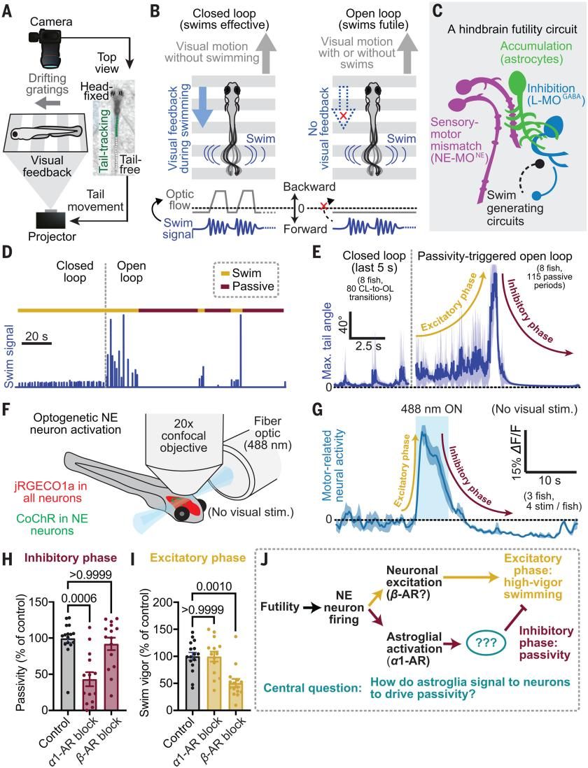 2025年5月15日美国霍华德休斯医学院Misha B. Ahrens研究组在《Science》上发表了名为“Norepinephrine changes behavioral state through astroglial purinergic signaling”的文章,首次揭示了星形胶质细胞嘌呤能信号在去甲肾上腺素(NE)介导的行为状态转变中的核心作用。研究团队以幼年斑马鱼为模型,发现在无效游泳的过程中,NE能够快速兴奋神经元网络导致行为增强;同时又通过星形胶质细胞嘌呤能信号介导的延迟抑制通路使行为在增强之后受到抑制。这一发现揭示了星形胶质细胞在神经网络功能中发挥的主动调控作用,进一步加深了对神经-胶质交互网络的理解。