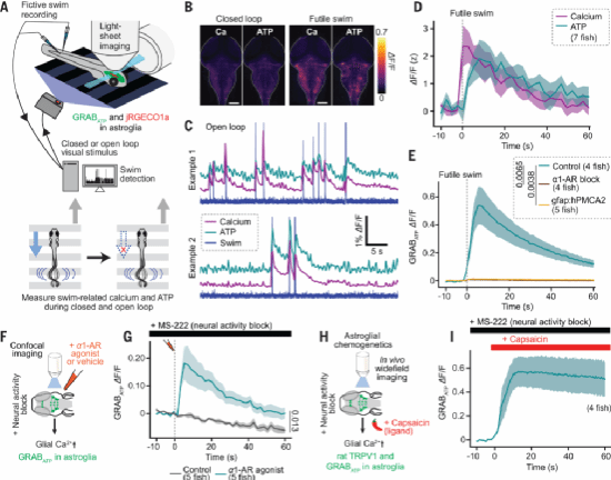 那么星形胶质细胞的激活为什么会抑制游泳行为呢?研究人员推测它释放了某种神经活性物质,将信息传递给下游神经元。鉴于胶质来源的ATP对神经功能具有调控作用,因此他们首先锁定ATP。通过成像技术,研究人员发现无效游泳确实引发后脑ATP含量大幅上升,并且进一步证明这种变化是由星形胶质细胞中α1-ARs激活导致的。因此,无效行为能触发星形胶质细胞释放ATP,这一过程需要NE参与。