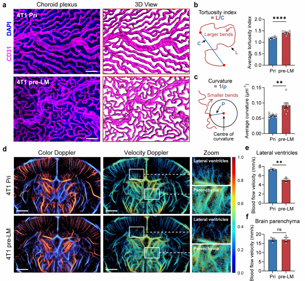 更为关键的是,这一阶段脉络丛的血管结构与功能发生了全面“异化”:血管形态呈现异常迂曲的“肿瘤样”改变,伴随血流动力学紊乱与血管屏障完整性破坏。这种病理改变具有高度的脉络丛组织特异性,在机体其他血管屏障结构中并未出现——这意味着,肿瘤细胞在“抵达战场”之前,已经远程改写了中枢边界的“地形图”。