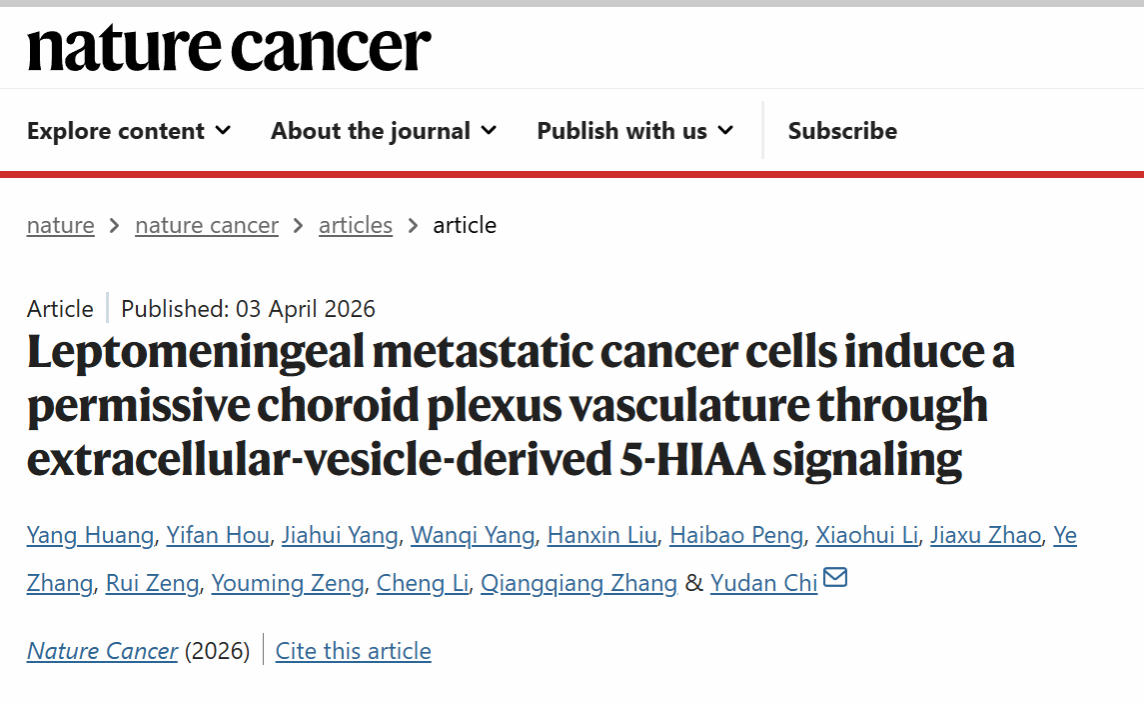 基于这一洞察,该团队2026年4月3日发表于Nature Cancer的最新研究“Leptomeningeal metastatic cancer cells induce a permissive choroid plexus vasculature through extracellular-vesicle-derived 5-HIAA signaling”将视角聚焦于中枢边界的另一道关键防线——脉络丛血管屏障,深入揭示了肿瘤细胞在抵达中枢之前,如何远程“异化”这一结构,为自身入侵铺平道路。这种转移路径与传统的中枢神经系统原发肿瘤截然不同:胶质瘤等原发肿瘤在脑内“就地起势”,而脑膜转移瘤在萌芽期则上演了一场“远程预谋”——肿瘤细胞在千里之外的外周,通过细胞外囊泡递送代谢分子5-HIAA,精准靶向脉络丛血管内皮细胞,提前瓦解中枢边界的防御体系,待“防线崩溃”后再从容定植。