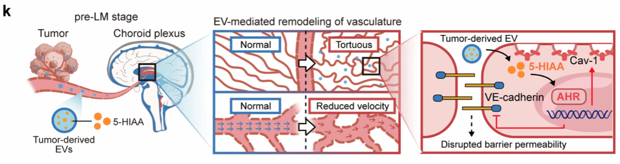 进一步研究证实,脉络丛中升高的5-HIAA并非来自中枢局部合成,而是直接来源于外周原发肿瘤细胞。肿瘤细胞通过分泌携带大量5-HIAA的细胞外囊泡(EVs),经血液循环靶向递送至脉络丛血管内皮细胞——在癌细胞抵达中枢之前,一封“投名状”已经送达,提前瓦解了中枢边界的防御体系。